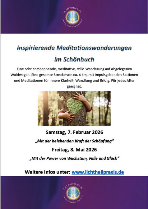 Eine sehr entspannende, meditative, stille Wanderung auf abgelegenen Waldwegen. Eine gesamte Strecke von ca. 4 km, mit impulsgebenden Stationen und Meditationen für innere Klarheit, Wandlung und Erfolg. Die Wanderung ist für jedes Alter geeignet.